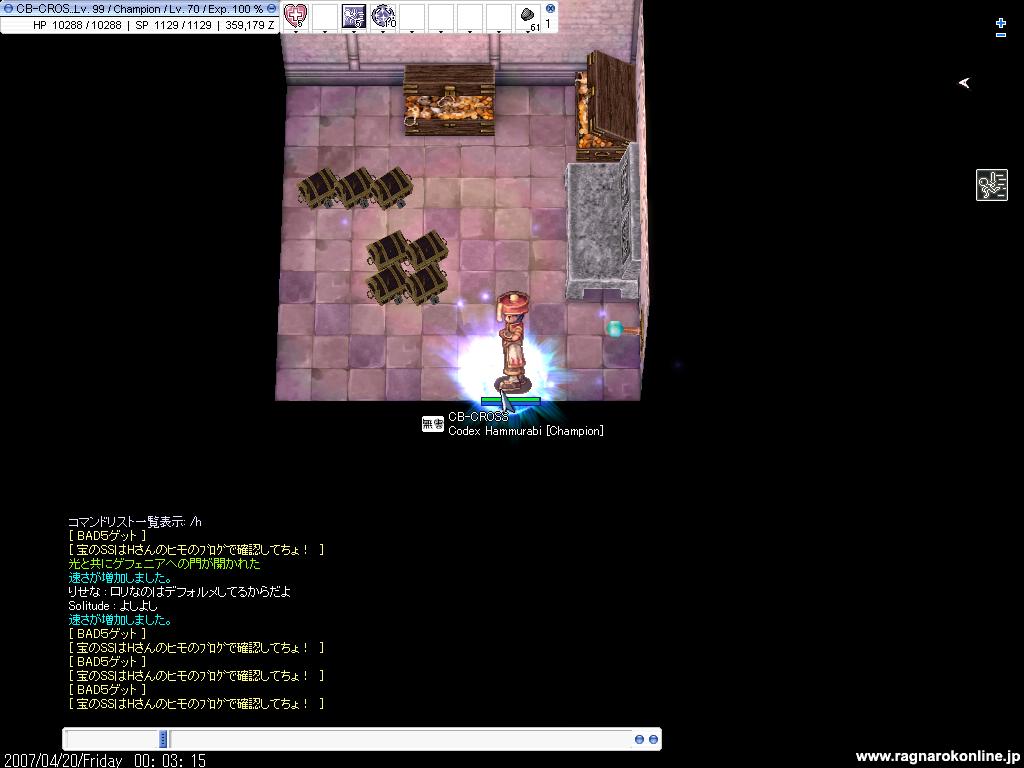 おわた。 と思ったんですが一応AXを起動してレース会場のB5に。 最後に落としたというねwwwwwww Gv出てたのが4人だったんで、宝は4人で山分け予定。 ゲフェADが使えるのでwizをちょっとあげないとーって感じですかね。 というわけで証拠ssをEDさんに頼まれたので張っておく